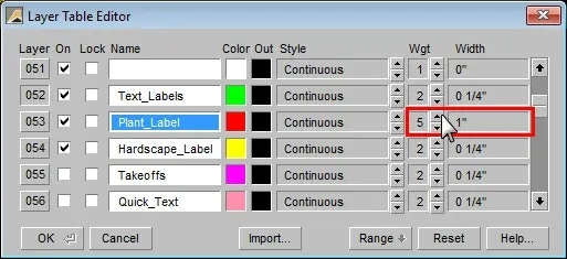 An example is shown here: to increase line weight for the Plant Label layer, open the Layer Table Editor, then click on the Up arrow between the Wgt and Width column.